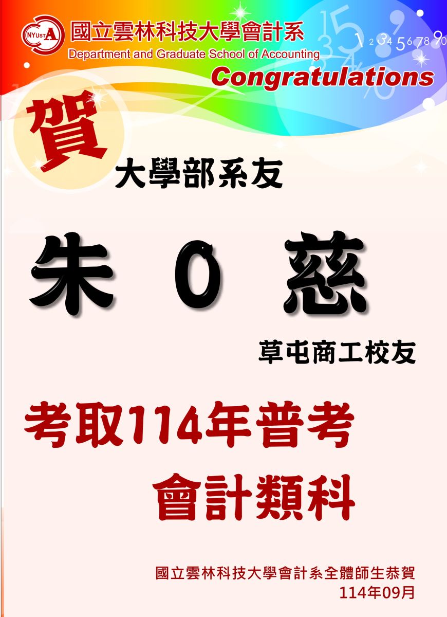 恭賀~大學部系友朱O慈(草屯商工校友)考取114年普考會計類科