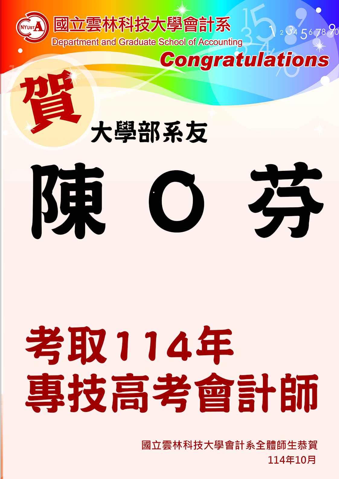 恭喜~大學部系友陳O芬考取114年專技高考會計師