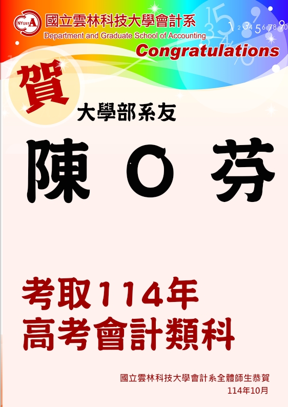 恭喜~大學部系友陳O芬考取114年高考會計類科
