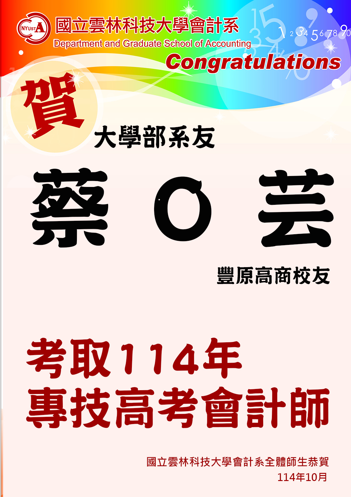 恭喜~大學部系友蔡O芸(豐原高商校友)考取114年專技高考會計師