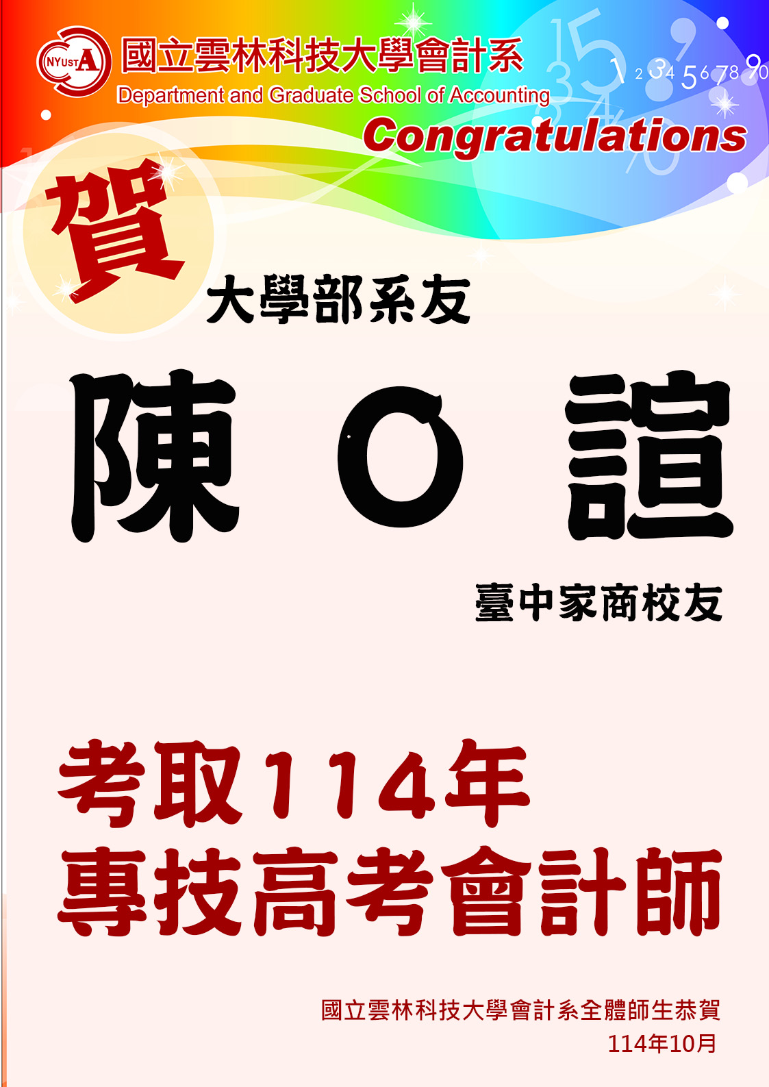 恭喜~大學部系友陳O諠(臺中家商校友)考取114年專技高考會計師