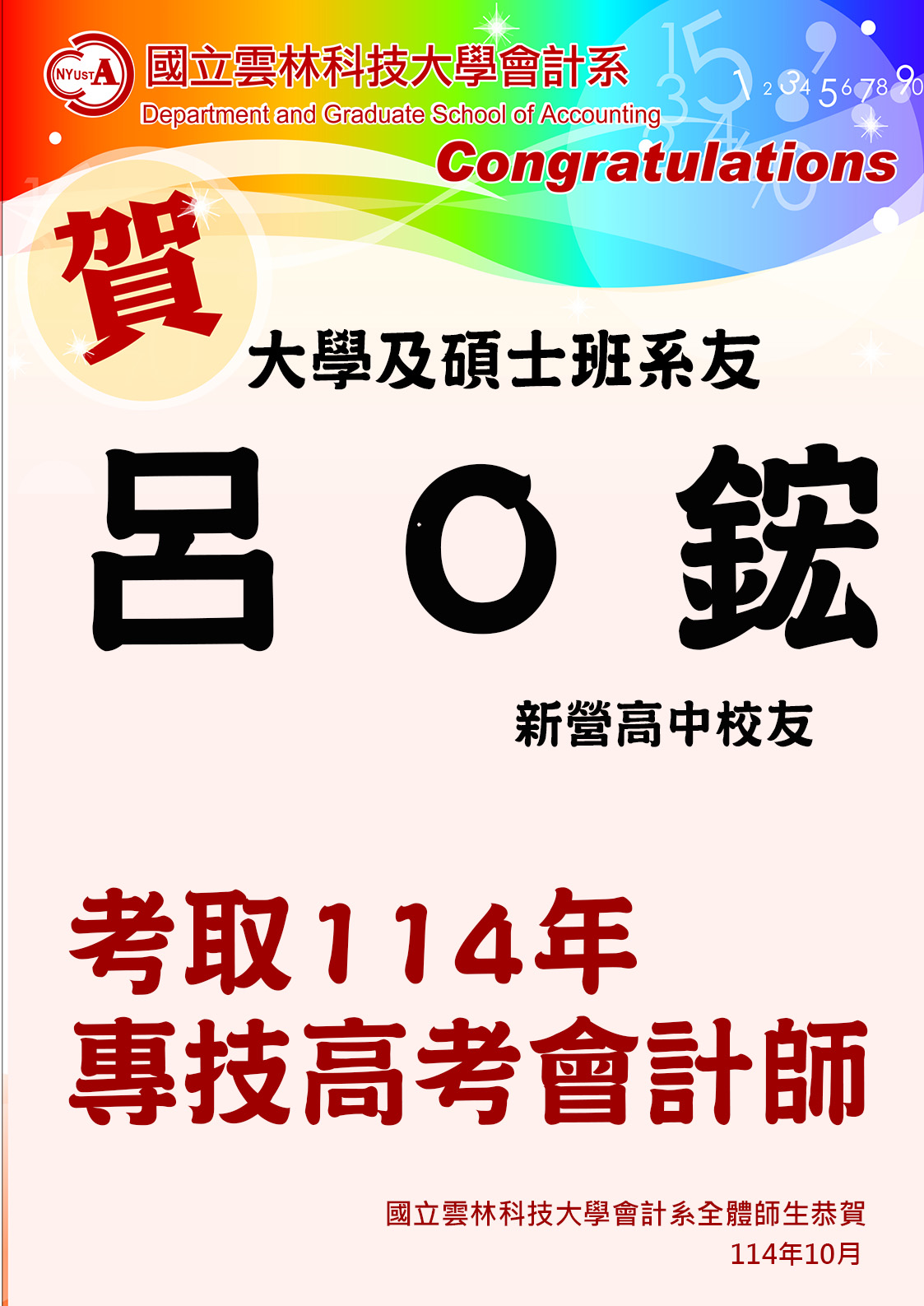 恭喜~碩士班系友呂O鋐(新營高中校友)考取114年專技高考會計師