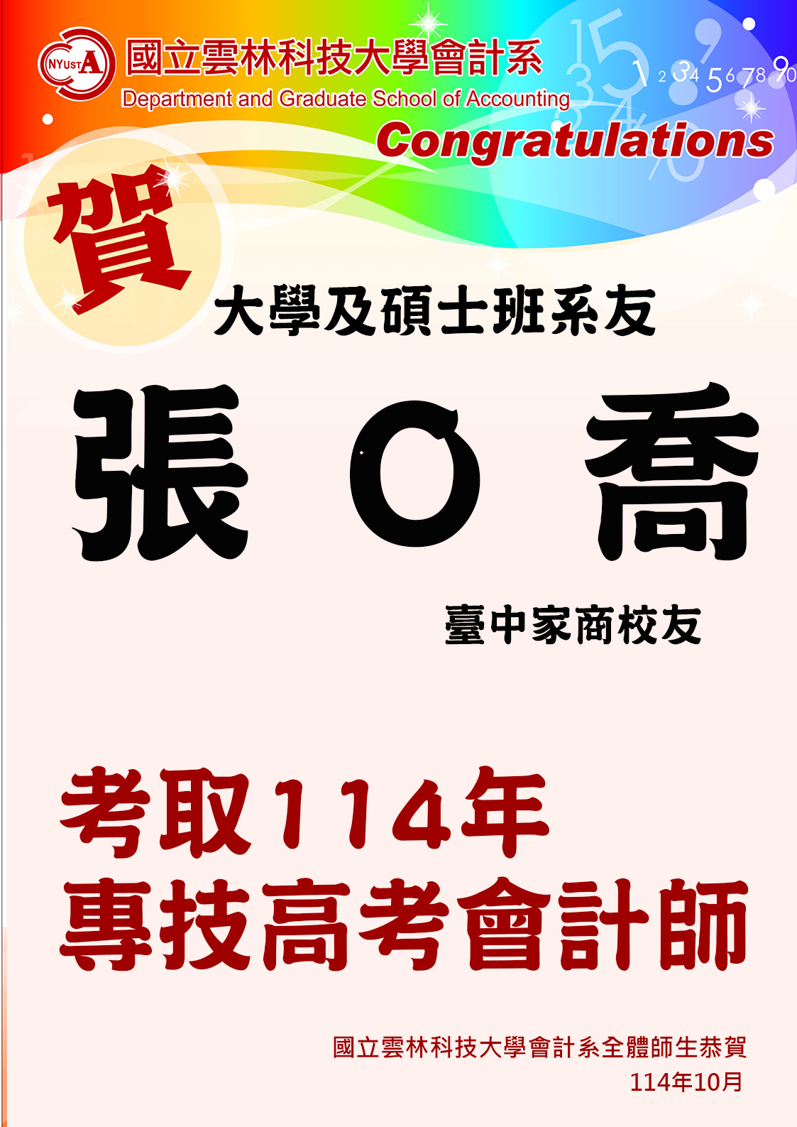 恭喜~碩士班系友張O喬(臺中家商校友)考取114年專技高考會計師