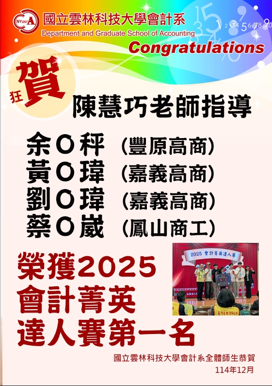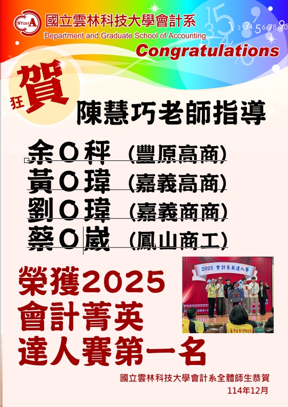恭喜~陳慧巧老師指導余O秤、黃O瑋、劉O瑋、蔡O崴榮獲2025會計菁英達人賽第一名