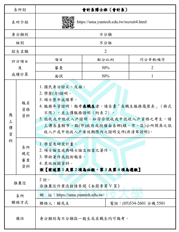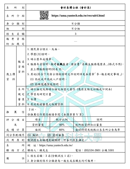 1. 招生名額:3名(含甄試生2名) 2. 最低畢業總學分數為36學分(不含畢業論文6學分)。 3. 考試詳細內容及招生名額等訊息,請以當年度招生簡章為主。 4. 本校招生網站:https://examweb.yuntech.edu.tw/WebExams/ 5. 本次招生得錄取若干名列為備取生,其名額由招生委員會視考生成績決定。 6. 身分類別為空白者為一般生或在職生均可報考,一般生及在職生同一評分標準,遞補方式依成績高低順序而定並擇優錄取;另實際錄取名額視考生成績而定,未達最低錄取標準者,雖有名額亦不錄取,最低錄取標準由招生委員會決定。 |